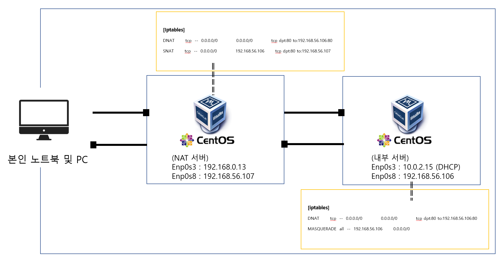다음과 같이 Iptables를 설정하여 NAT 서버의 Public IP를 가정한 192.168.0.13 으로 요청을 보내면 192.168.56.106번 서버로 패킷의 흐름을 변환하여 192.168.56.106번의 데이터를 싣고 외부로 반환되게 됩니다.