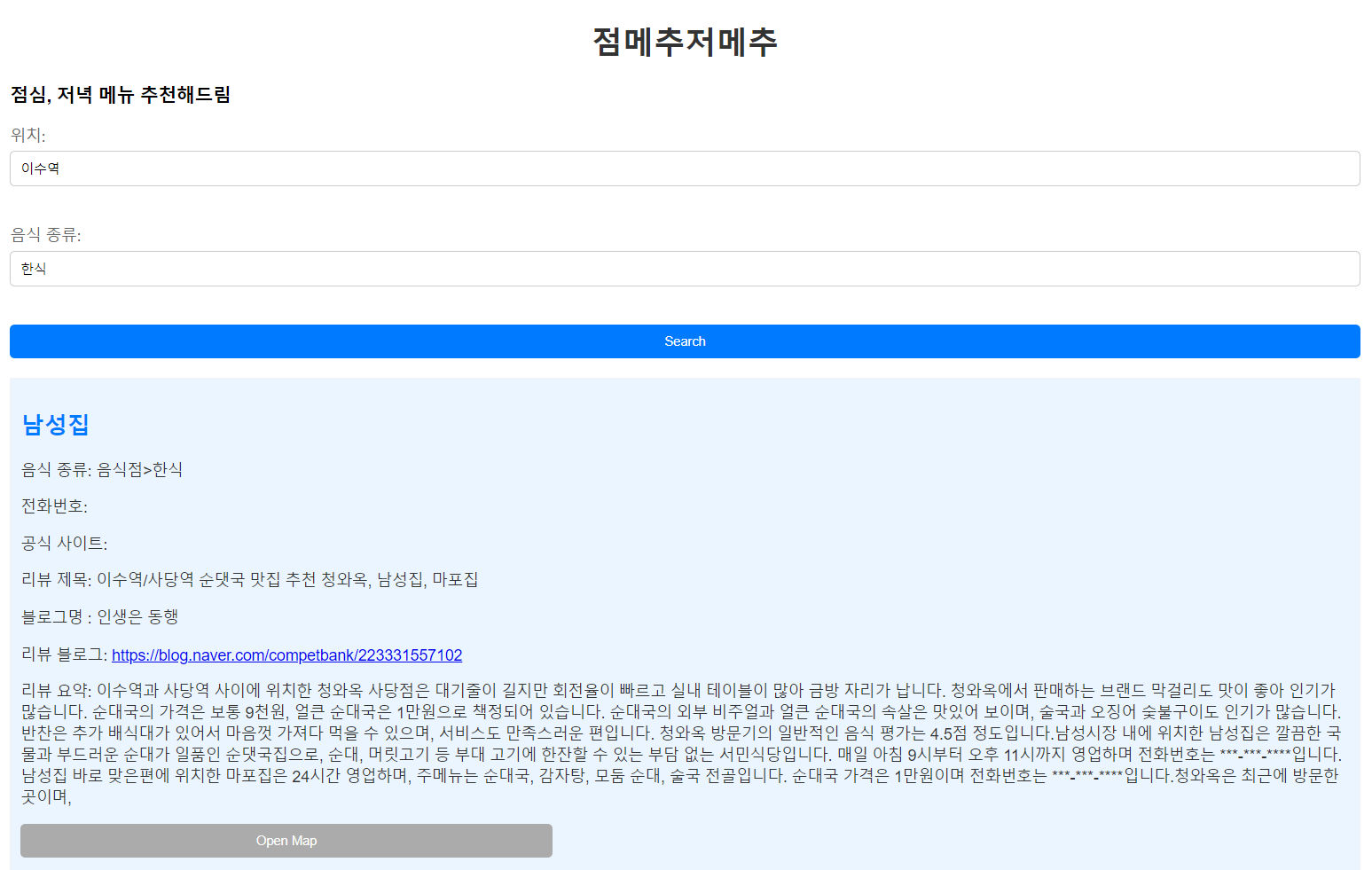 NCP API와 HyperClova X 서비스를 이용한 점메추저메추 서비스이며, 사용자가 위치(지역)과 음식 카테고리를 입력하면 Naver API로 데이터를 1차 가공 후 Beautiful Soup로 필요한 정보를 추출하여 HyperClova X를 이용하여 블로그 내용을 요약하는 서비스 입니다.