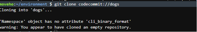 moveho:~/environment $ git clone codecommit://dogs