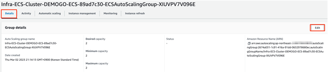 2. Infra-ECS-Cluster-DEMOGO-ECS Auto Scaling Group을 클릭 하고 Details 탭으로 이동하여 Edit를 클릭 합니다.