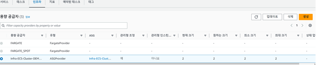 1.ECS로 이동해서 클러스터를 선택합니다. 인프라 탭을 클릭한 다음 용량 공급자 블록에 3개의 용량 공급자가 이미 있음을 확인합니다.