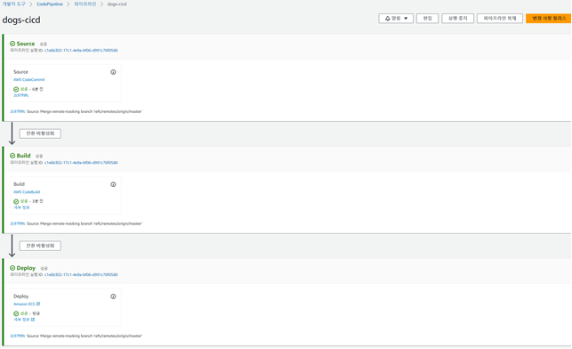 3. CodePipeline으로 이동해서 배포단계까지 완료 될 때까지 기다립니다.