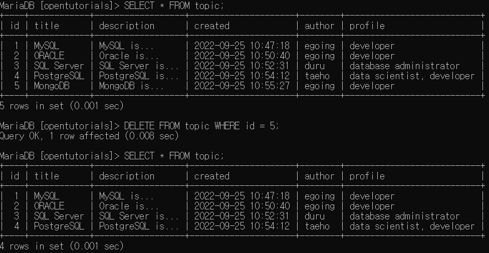 DELETE FROM topic WHERE id = 5; 를 이용해 삭제해봤다