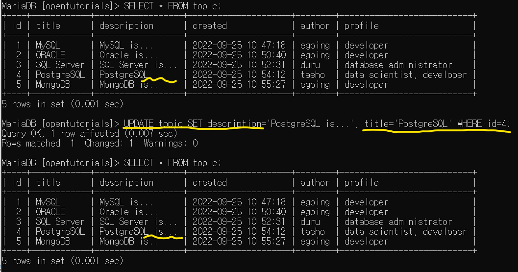 UPDATE topic SET description='PostgreSQL is...', title='PostgreSQL' WHERE id=4;