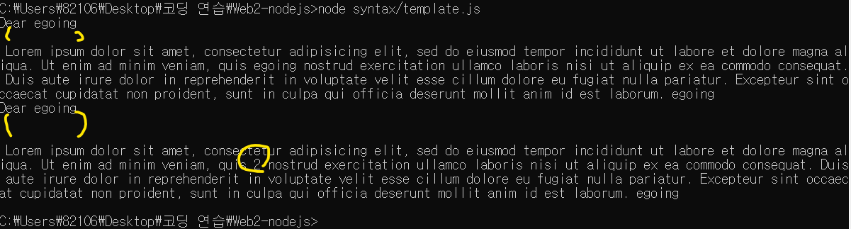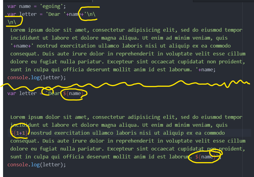 템플릿을 쓸 때 키보드 ~ 아래에 있는 ` 이 문자를 사용해준다. 이것을 사용해주게 되면 띄워쓰기도 \n\ 을 쓸 필요 없이 작동되고 ${ } 괄호 안 1+1같은 산술연산을 넣게 되면 편하게 산술연산이 작동한다.