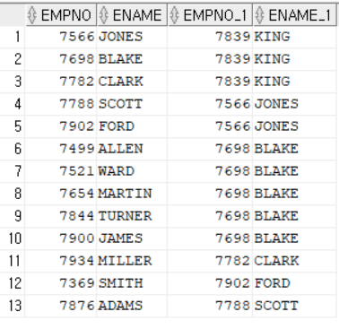 SELECT A.EMPNO, A.ENAME, B.EMPNO, B.ENAME FROM EMP A, EMP B