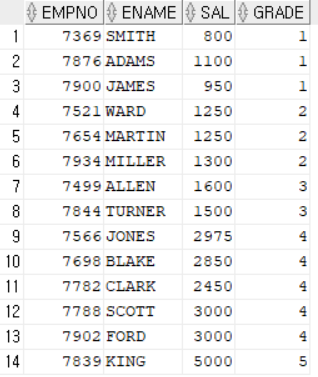 SELECT EMPNO, ENAME, SAL, GRADE FROM EMP, SALGRADE