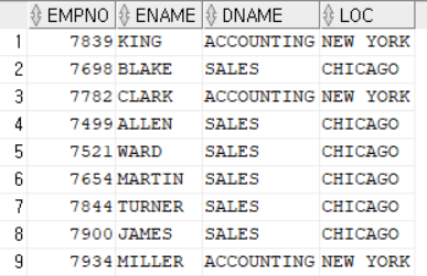 SELECT EMPNO, ENAME, DENAME, LOC FROM EMP NATURAL JOIN DEPT