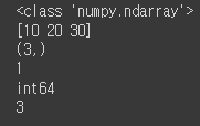 # [10,20,30] 리스트 데이터를 ndarray로 생성하기