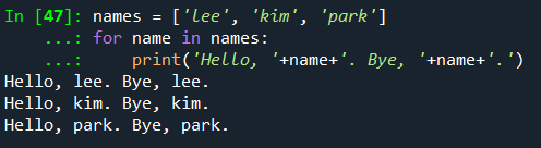 For ~ in 반복문을 사용해서 인사해보는 프로그램을 만들기
