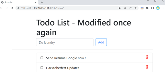 http://192.168.56.101:30535/todos/   #본인의 node ip주소 및 NodePort로 접속